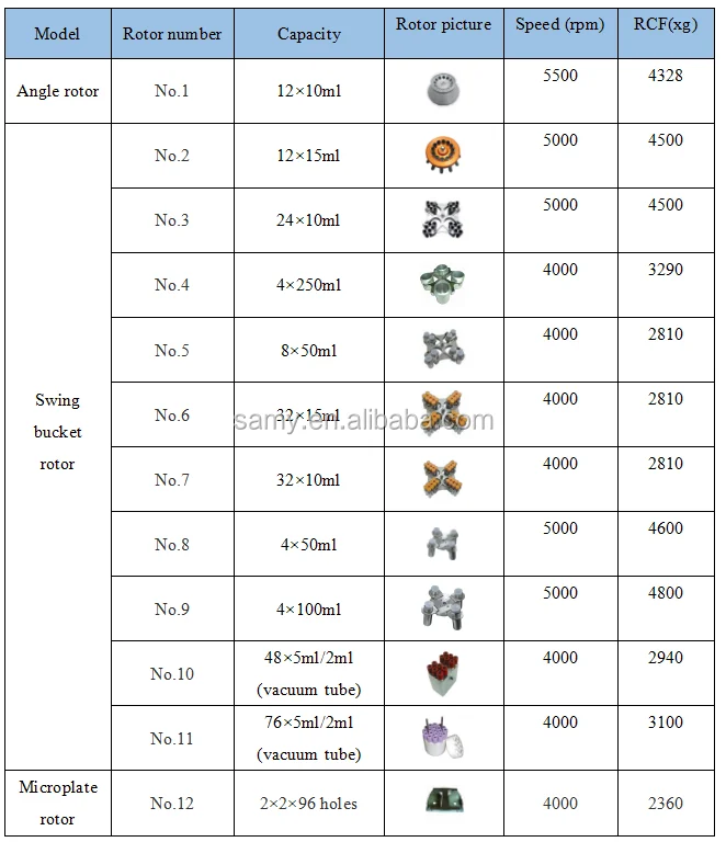 Each set of centrifuge could be equiped with different rotor, TD5A lab centrifuge could be equiped with 12x10ml Angle rotor, 12×15 ml, 24×10ml , 2×250 ml , 8×50 ml , 32×15 ml , 32×10ml, 4×100ml ,4×50 ml , 4×100 ml, 48×5ml/2ml (vacuum tube), 76×5ml/2ml (vacuum tube) Swing bucket rotor and 2x2x96 holes Microplate rotor.